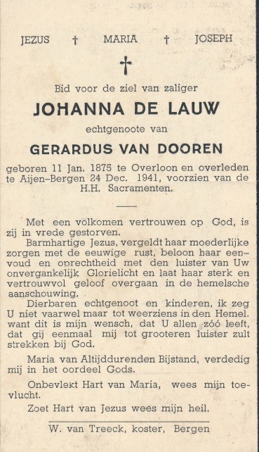 Gerardus van Dooren is geboren op vrijdag 13 juni 1873 in Sambeek. Gerardus is overleden op zaterdag 23 mei 1964 in Venray, 90 jaar oud. Hij is begraven op woensdag 27 mei 1964 in Bergen. Gerardus trouwde, 26 jaar oud, op maandag 5 februari 1900 in Maashees en Overloon, voormalige gemeente, provincie Noord-Brabant met Johanna de Lauw, 25 jaar oud. Johanna is geboren op maandag 11 januari 1875 in Overloon, provincie Noord- Brabant. Johanna is overleden op woensdag 24 december 1941 in Aijen, 66 jaar oud.