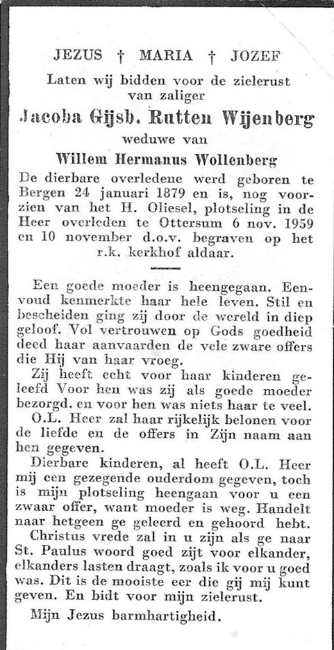 Johanna Catharina (Cato) Rutten Wijenberg is geboren op donderdag 27-12-1877 in Bergen, provincie Limburg, dochter van Johannes Rutten Wijenberg en Engelina Swijen. Cato is overleden op zondag 05-07-1959 in Venray, provincie Limburg, 81 jaar oud. Cato: