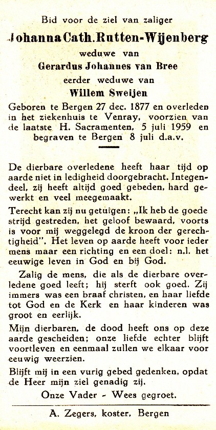 (2) trouwde, 39 jaar oud, op donderdag 18-01-1917 in Bergen, provincie Limburg met Gerardus Johannes (Jan) van Bree, 30 jaar oud. Jan is geboren op maandag 28-06-1886 in Sambeek, provincie Noord-Brabant. Jan is overleden op dinsdag 30-03-1948 in Venlo, provincie Limburg, 61 jaar oud. Hij is begraven op zaterdag 03-04-1948 in Bergen, provincie Limburg.