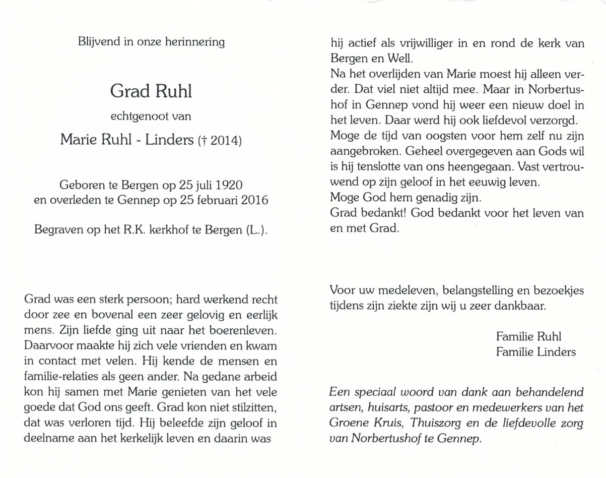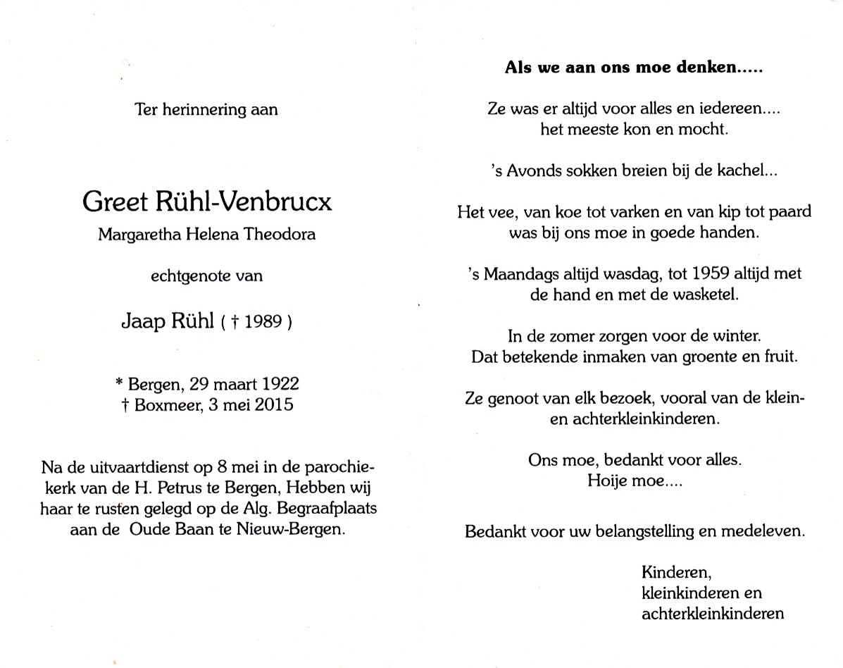 Jacobus (Jaap) Ruhl is geboren op dinsdag 16-10-1917 in Bergen, provincie Limburg, zoon van Lambertus Rühl en Petronella Giesbers. Jaap is overleden op woensdag 22-02-1989 in Bergen, provincie Limburg, 71 jaar oud. Hij is begraven op zaterdag 25-02-1989 in Nieuw-Bergen. Jaap trouwde met Margaretha Helena Theordora (Greet) Venbrucx. Greet is geboren op woensdag 29-03-1922 in Bergen, provincie Limburg. Greet is overleden op zondag 03-05-2015 in Boxmeer, provincie Noord-Brabant, 93 jaar oud. Zij is begraven op vrijdag 08-05-2015 in Nieuw-Bergen.