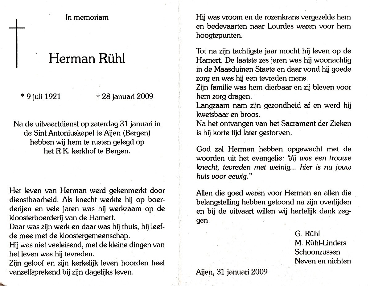 Herman is overleden op woensdag 28-01-2009 in Bergen, provincie Limburg, 87 jaar oud.