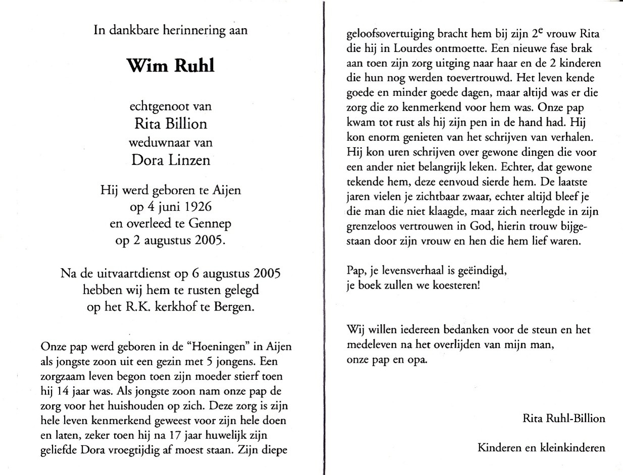 Wim is overleden op dinsdag 02-08-2005 in Gennep, provincie Limburg, 79 jaar oud. Wim: