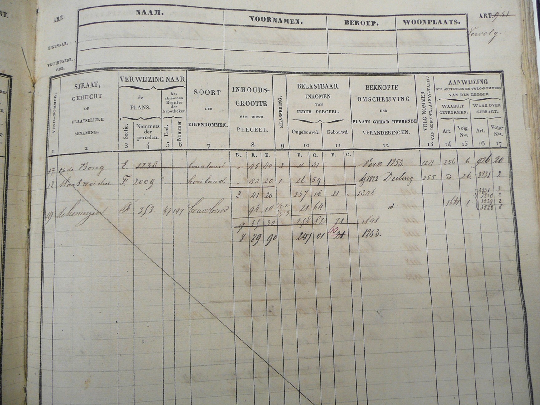 Bij akte van 7 november 1839 opgemaakt door notaris Roersch komen de nabestaanden van Johannes en Catharina tot een verdeling van de percelen bouw- wei- en hooiland.