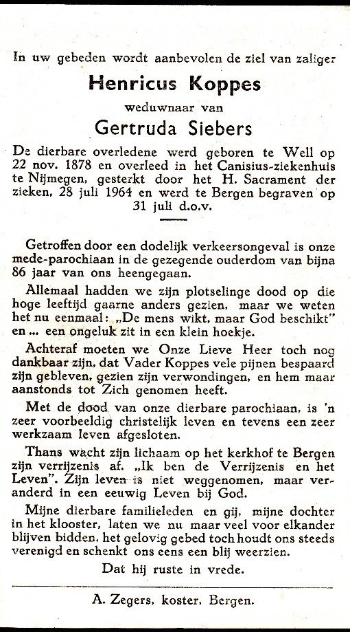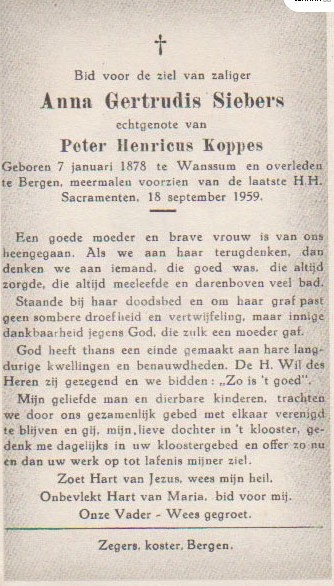 Hier is het huis overgegaan op Peter Henricus Koppes is geboren op vrijdag 22 november 1878 in Well, zoon van Godefridus Koppes en Petronella Rutten. Peter is overleden op dinsdag 28 juli 1964 in Nijmegen, 85 jaar oud. Hij is begraven op vrijdag 31 juli 1964 in Bergen. Peter trouwde, 31 jaar oud, op vrijdag 6 mei 1910 in Bergen met Anna Gertrudis Jacoba Siebers, 32 jaar oud. Anna is geboren op maandag 7 januari 1878 in Wanssum, dochter van Peter Nicolaas (Pieter) Siebers en Anna Catharina Swijen. Anna is overleden op vrijdag 18 september 1959 in Bergen, 81 jaar oud.