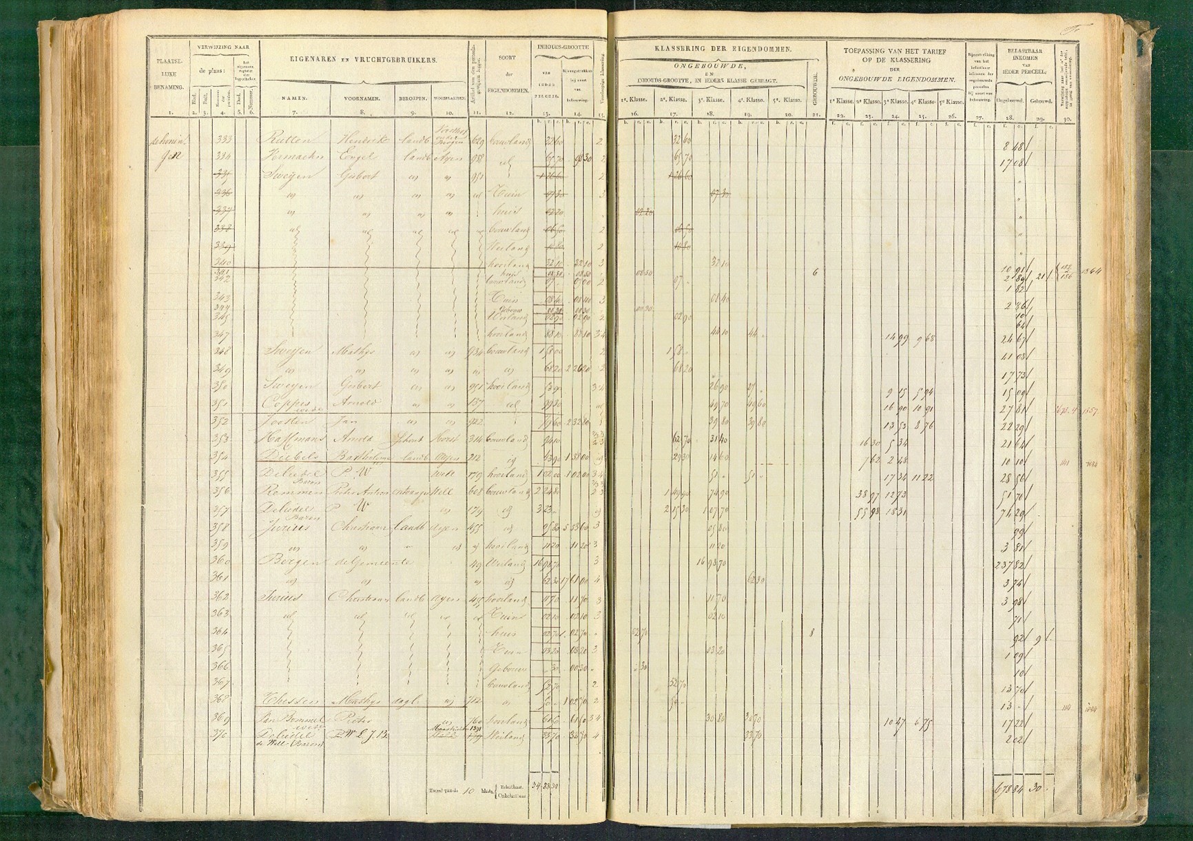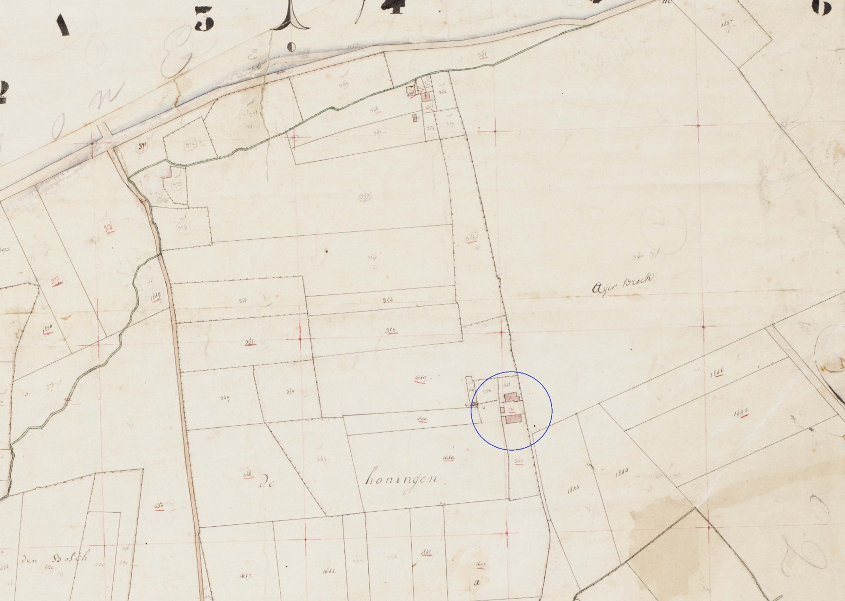 Hier zien we ook dat Gisbert Sweijen ook eigenaar is van huis E 337. Dit staat wel in de aanwijzende tafel maar is niet terug te vinden op de kadasterkaart. Gezien de nummering is het aannemelijk dat de boerderij beneden de blauwe cirkel E 337 is geweest. En waarschijnlijk voor het vervaardigen van de kaart reeds is afgebroken.