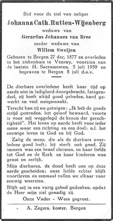 Johanna Catharina (Cato) Rutten Wijenberg is geboren op donderdag 27-12-1877 in Bergen, provincie Limburg, dochter van Johannes Rutten Wijenberg en Engelina Swijen. Cato is overleden op zondag 05-07-1959 in Venray, provincie Limburg, 81 jaar oud. Cato: