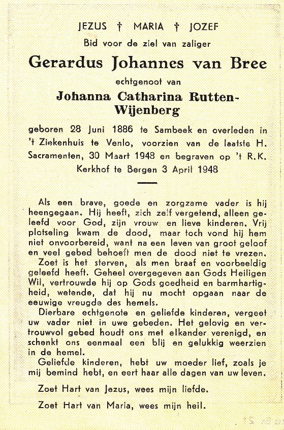 6 Wilhelmus Hendrikus (Wim) van Bree, geboren op donderdag 05-10-1922 in Bergen, provincie Limburg. Wim is overleden op dinsdag 27-11-1984 in Bergen, provincie Limburg, 62 jaar oud. Hij is begraven in Nieuw-Bergen.