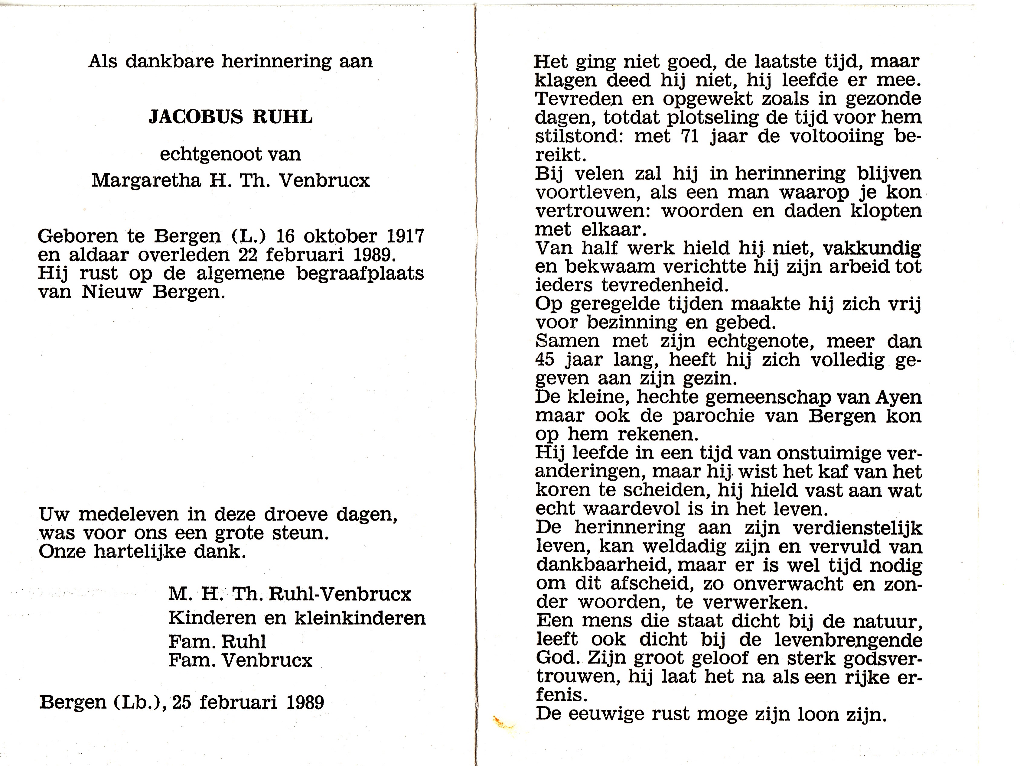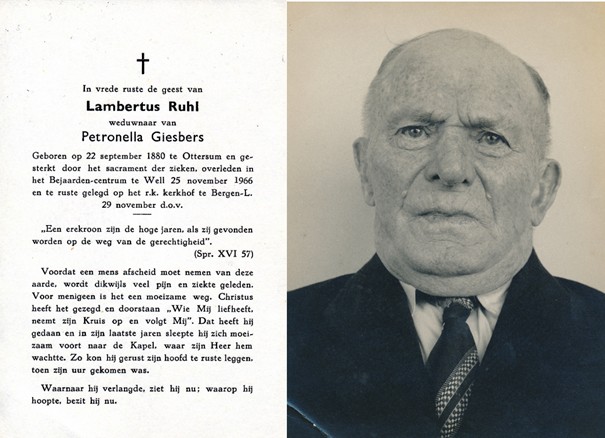 Jacobus (Jaap) Ruhl is geboren op dinsdag 16-10-1917 in Bergen, provincie Limburg, zoon van Lambertus Rühl en Petronella Giesbers. Jaap is overleden op woensdag 22-02-1989 in Bergen, provincie Limburg, 71 jaar oud. Hij is begraven op zaterdag 25-02-1989 in Nieuw-Bergen. Jaap trouwde met Margaretha Helena Theordora (Greet) Venbrucx. Greet is geboren op woensdag 29-03-1922 in Bergen, provincie Limburg. Greet is overleden op zondag 03-05-2015 in Boxmeer, provincie Noord-Brabant, 93 jaar oud. Zij is begraven op vrijdag 08-05-2015 in Nieuw-Bergen.