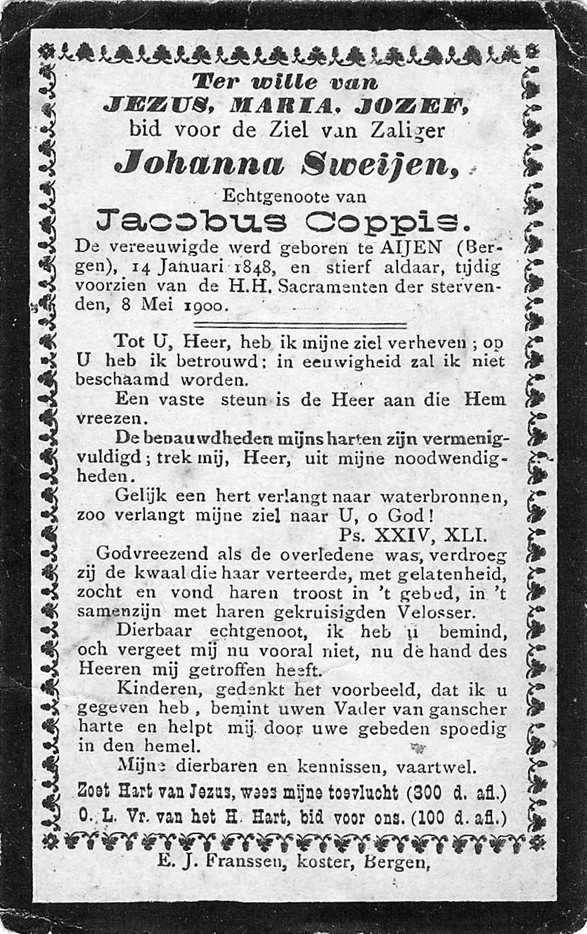 7 Johanna Swijen Schrijen, Strijen, geboren op vrijdag 14-01-1848 in Bergen, provincie Limburg.