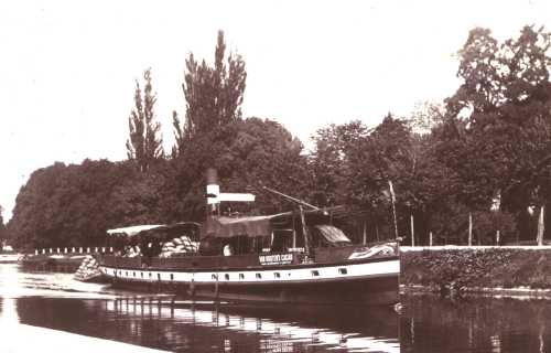 De boot ligt onder stoom en is bezig te vertrekken de loopplanken zijn aan boord gehaald en twee personen zijn bezig de boot verder van de kant te duwen. Zou er te ontdekken zijn welke boot dit is ?