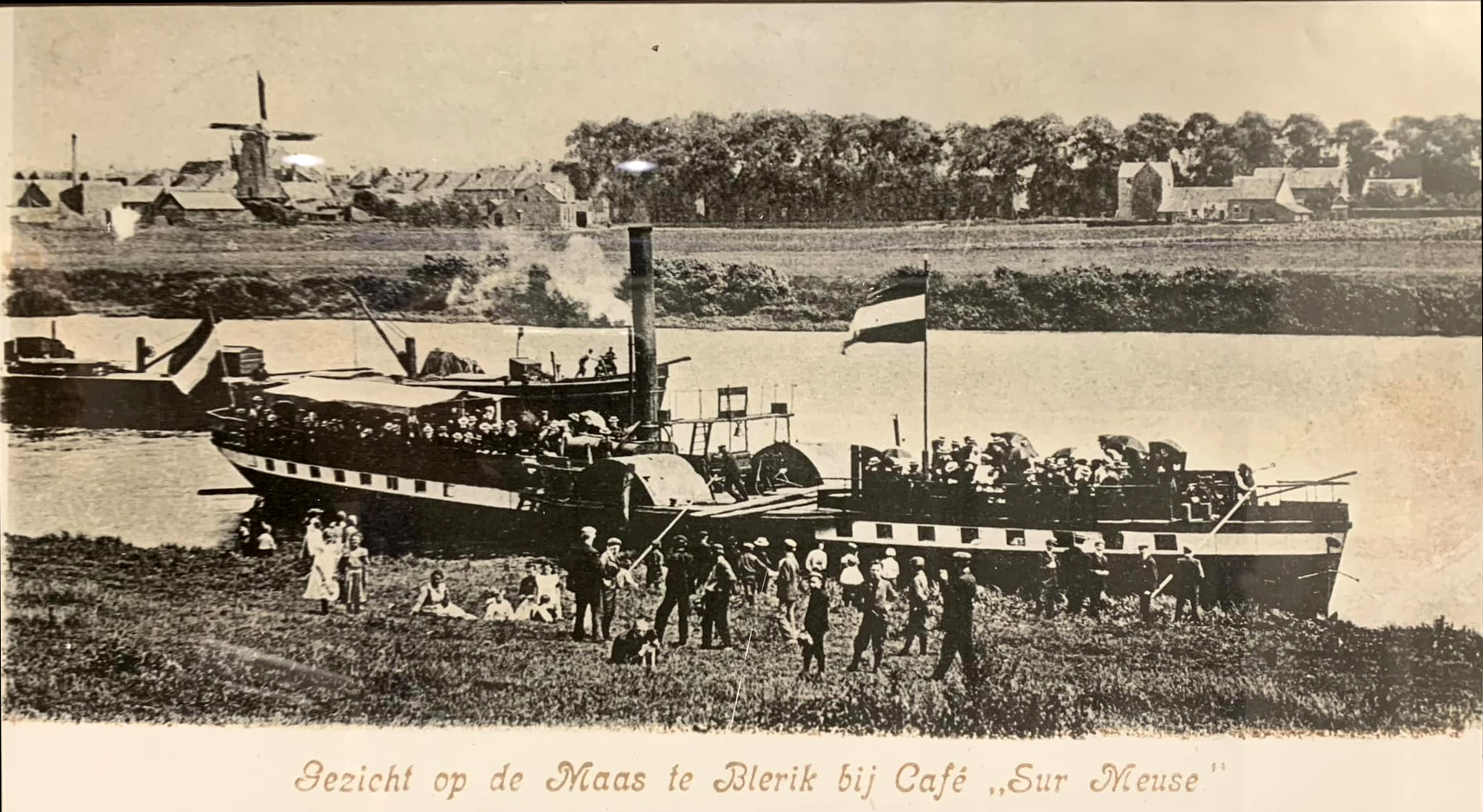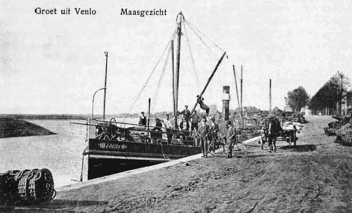 De raderboot ligt/lag aan de wal bij “Sur Meuse” in Blerick. Met zicht op de molen van Van der Steen gelegen in Venlo. De molen is in 1883 gebouwd en is verdwenen in 1918. De bomen begrenzen de Tegelseweg.